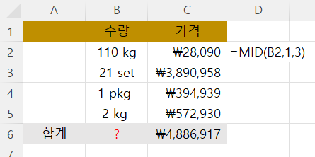 그래서 B2셀에서 '110' 글자만 추출하고 싶다고 하면 D2셀에