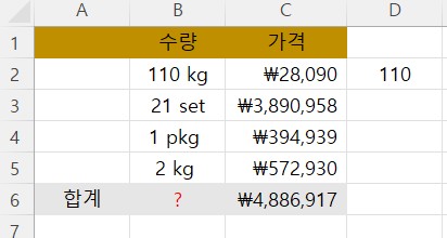 2. D2셀에 110kg에서 단위를 제외한 숫자, 110만 입력해 봅니다.