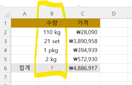합계 SUM 수식을 사용하려면 숫자만 있어야 가능한데,